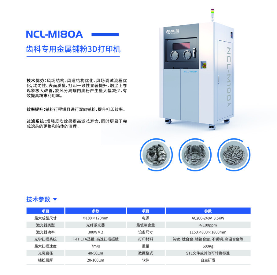 雅可美钛冠突破传统铸造工艺限制,采用全流程数字化设计和生产。自主研发的齿科专用纯钛3D打印机NCL-M180A,从风场结构、风道结构、风场调试流程、工艺参数等方面进行了全面优化设计,打印出的钛冠均匀性、表面质量、致密性、边缘密合性显著提升,解决了传统铸造钛冠的砂眼、气泡等技术性难题,实现了钛冠品质的跨越式提升。